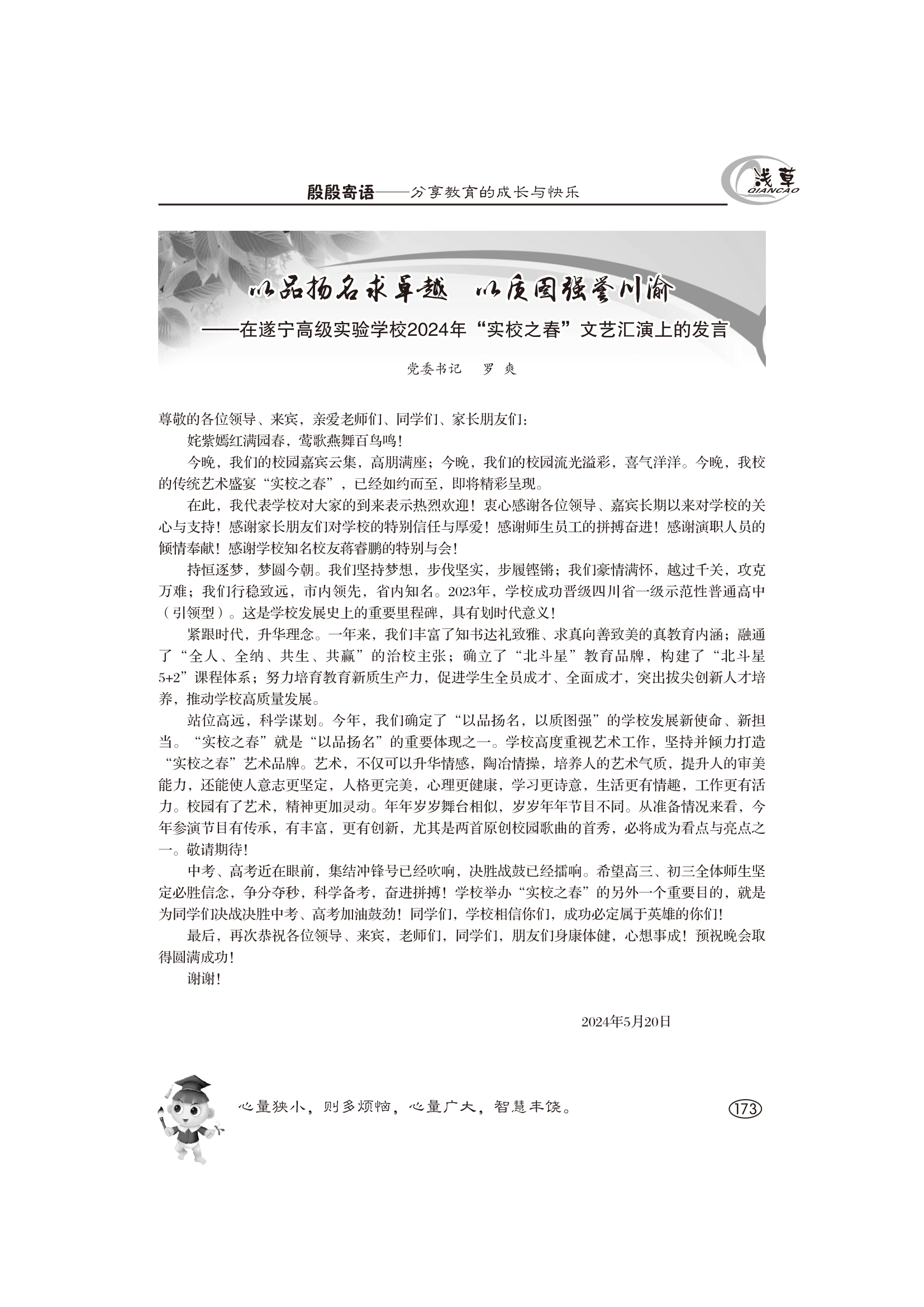 以品揚(yáng)名求卓越,以質(zhì)圖強(qiáng)譽(yù)川渝--2024年實(shí)校之春文藝匯演上的發(fā)言