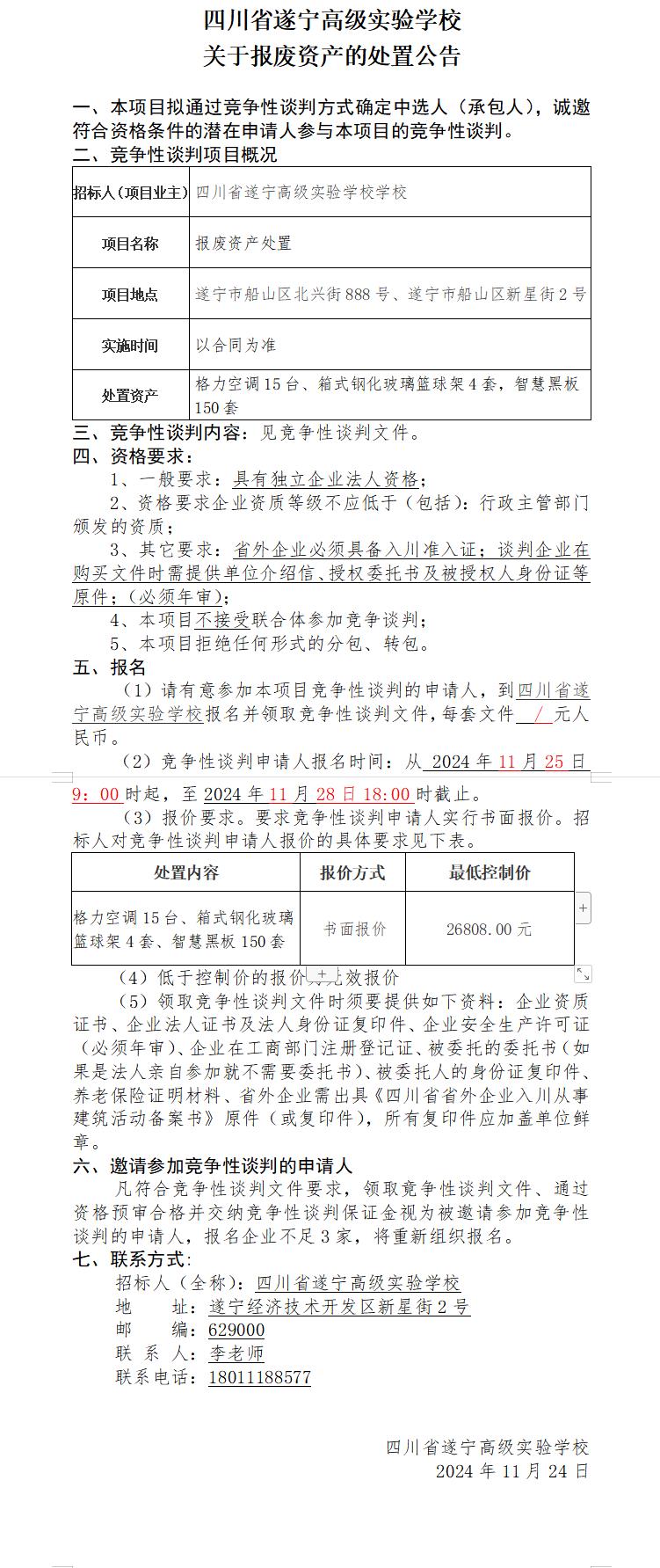 四川省遂寧高級(jí)實(shí)驗(yàn)學(xué)校 關(guān)于報(bào)廢資產(chǎn)的處置公告