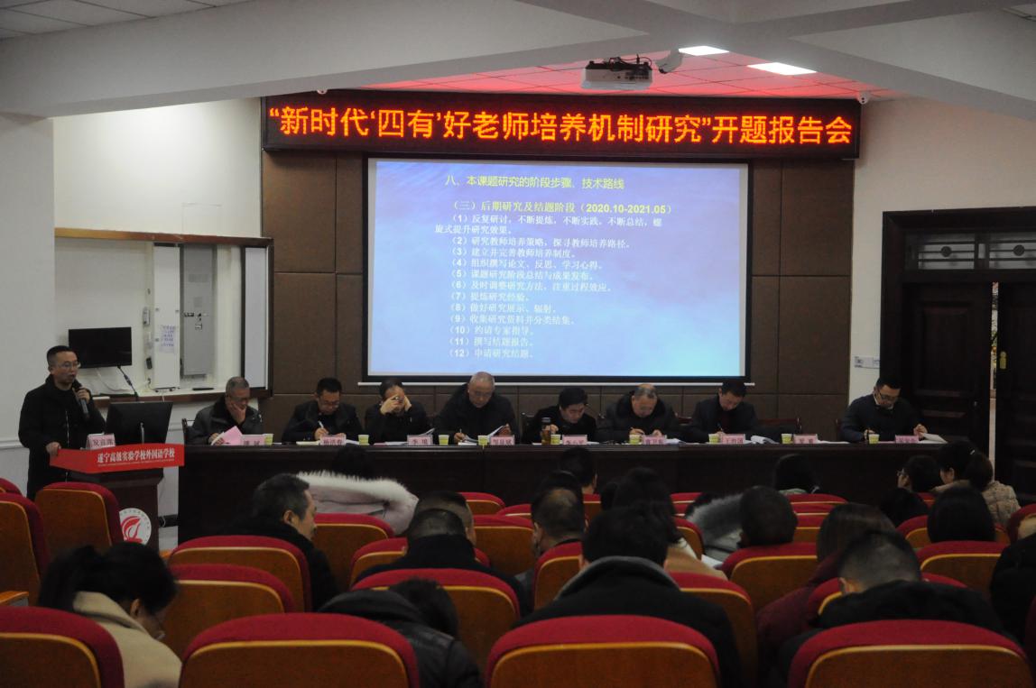 12月18上午,四川省教育廳下達(dá)的2019年度“四川省哲學(xué)社會科學(xué)重點(diǎn)研究基地”“四川省高校人文社會科學(xué)重點(diǎn)研究基地”“四川省中小學(xué)教師師德研究中心”教育科學(xué)研究課題《新時(shí)代“四有”好老師培養(yǎng)機(jī)制研究》開題報(bào)告會在遂寧高級實(shí)驗(yàn)學(xué)校外國語學(xué)校學(xué)術(shù)報(bào)告廳舉行。